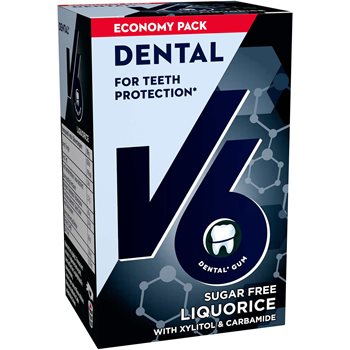 Sugar-free chewing gum from V6. Dental Care Liquorice has a lovely licorice flavor that refreshes your mouth in seconds. The taste is strong and persistent, and no compromise has been made with the taste, even though the chewing gum is sugar-free.