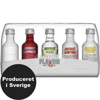 Smart pakke med 5 forskellige små vodkas fra absolut med 40% alkohol. Pakken indeholder smagsoplevelser originale (blå), citron, koriander og vanilje. Den svenske producent har solgt absolut siden 1879, der produceres i henhold til en mere end 400 år gammel opskrift på både destillation og aromatisering. Denne 5 -pack skal købes af dem, der ønsker lidt forskellige smag at vælge imellem - men det er også en dejlig gaveide.