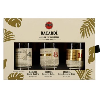 3-Pack Bacardi Premium Discovery 40% er pakken til dig, der gerne vil smage flere forskellige typer af Bacardi Rum for at finde din favorit. I pakken får du Bacardi Anejo Cuatro Rum, Bacardi Reserva Ocho Rum og Bacardi Gran Reserva Diez. Alt i 100 ml flasker.