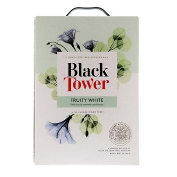 Black Tower Fruity White es un vino blanco dulce de Alemania. El vino tiene un sabor afrutado y aromas de miel, manzanas y peras. El vino se puede servir como una bebida de bienvenida, con aperitivos ahumados y con postres. Black Tower ha sido internacionalmente la marca alemana más popular durante los últimos 40 años. El vino es una bolsa en la caja de 3 litros y tiene un contenido de alcohol del 10%.