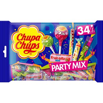 Chupa Chups Party Mix este o geantă plină de îndrăgitele și colorate Chupa Chups Candy. Geanta conține I.A. Cunoscuta acadele cu arome de căpșuni și mere și carameluri de fructe moi și bare de caramel fruct. Mixul perfect pentru petrecerea Mardi Gras sau Halloween.