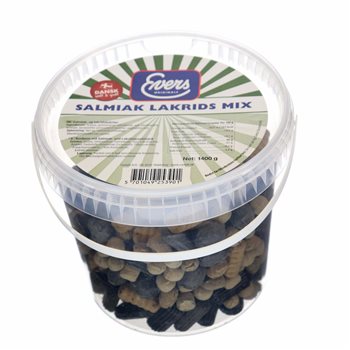 Mixul Licorice Evers Salmiak este un amestec fantastic de bomboane Salmiak și Licorice, care este sigur că va merge bine cu toți iubitorii de licor. Cizmele delicioase în formă de bile, rulouri și bare vin într -o găleată practică de plastic cu mâner.